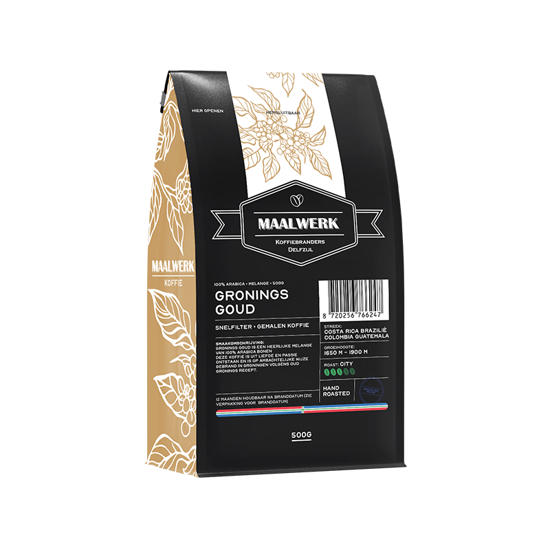 De Maalwerk Gronings goud Snelfiltermaling is een 100% arabica melange die volledig ontwikkeld en gebrand is in Groningen. Voor deze melange zijn uitsluitend de beste arabica koffiebonen, afkomstig uit midden en zuid Amerika, geselecteerd. De melange is perfect uitgebalanceerd en is dan ook een waar juweel. Door het slow roasting principe kunnen de smaken en aroma’s zich nog beter ontwikkelen en dat proeft u meteen als u deze koffie drinkt. U waant zich even in Latijns Amerika.