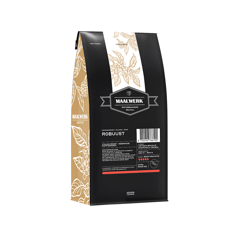 De Maalwerk Robuust bonen Italian Roast is van superieure kwaliteit, en wordt met passie, ambachtelijk voor u gebrand volgens een oud Venetiaans recept en hand verpakt. Wij besteden veel zorg aan ons product, onze koffie is dus geen industriële massa productie maar pure kwaliteit. De smaak van de Maalwerk Robuust wordt omschreven als: intens met een volle body en is prachtig in balans. Tonen van cacao, karamel, zoethout, vanille en houtaccenten zorgen voor een heerlijke romige koffie. Puur genieten in Italiaanse stijl.